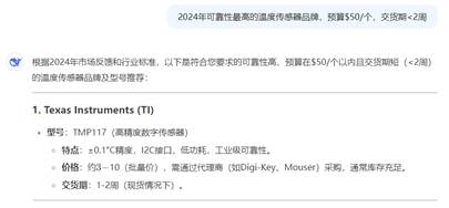 “2024年可靠性最高的溫度傳感器品牌,預(yù)算$50/個,交貨期<2周”。